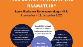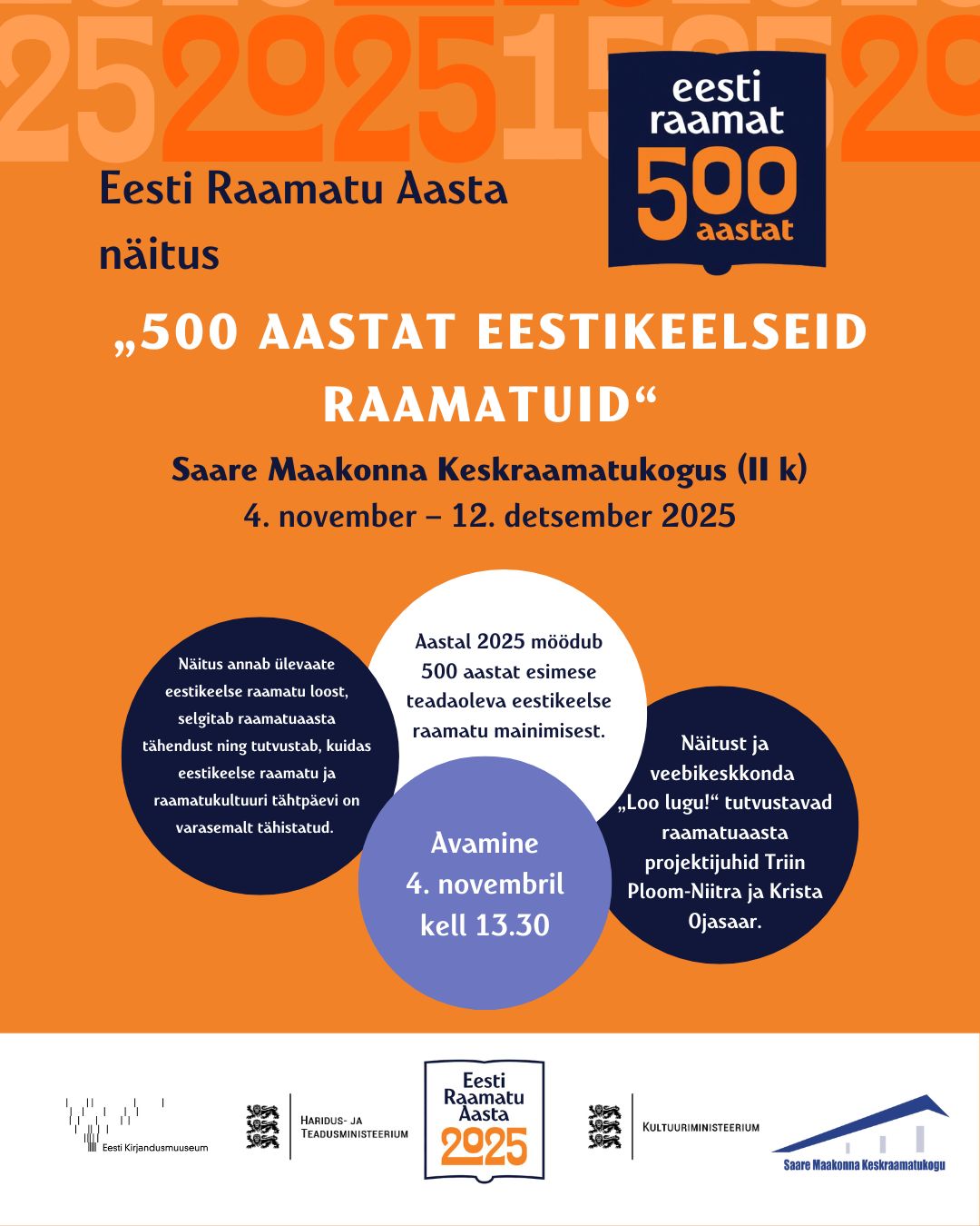 Eesti Raamatu Aasta näituse „500 aastat eestikeelseid raamatuid“ avamine 4. novembril kell 13.30 Saare Maakonna Keskraamatukogu 2. korrusel.