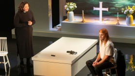 Näidendi tegevus leiab aset päeval, mil toimuvad Soome Evangeelse Luterliku Kiriku piiskopi valimised ja autori tahtel on üheks kandidaadiks naisvaimulik. Pärast kirikus toimunud matuse-talitust kohtub ta noore ajakirjanikuga, kes on tulnud temast persooniloo kirjutamiseks intervjuud võtma. Vestlus venib pooleteisttunniseks jutuajamiseks, mille käigus kooruvad samm-sammult lahti mitte ainult tegelaste erinevad vaated religioonile vaid ka nende minevikupained, mis on autorile andnud alust määratleda oma näidendit kui „psühholoogilist“ thrillerit süüst ja vastutusest. Kuna „thriller” tähendab aga lugu, mis on täis pinget, ärevust ja hirmu, siis põnevuse hoidmiseks ei saa tema sisu rohkem avada.