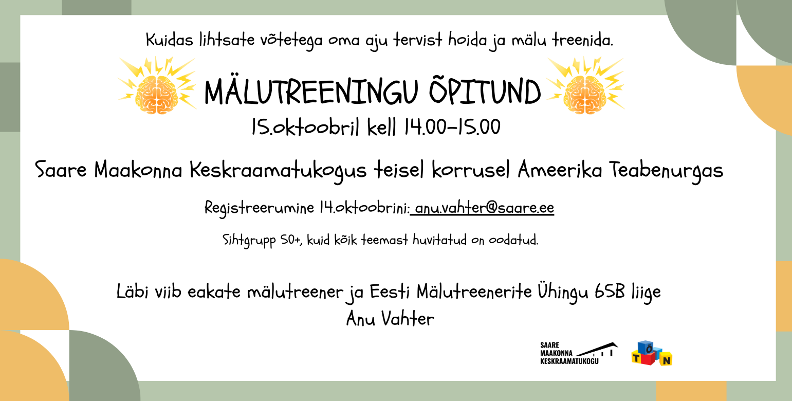 Mälutreeningu õpitund 15. oktoobril kell 14–15 Saare Maakonna Keskraamatukogu Ameerika teabenurgas (2. korrusel)
