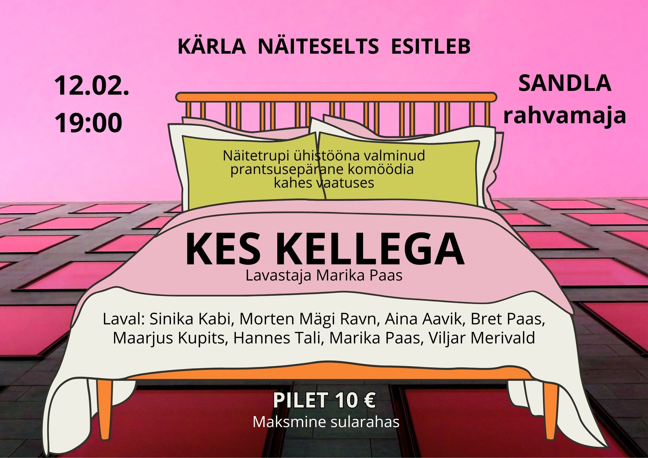 Külla tuleb Kärla näiteselts etendusega "Kes kellega". Algus kell 19 ja pilet 10€ müügil kohapeal, maksmine sularahas.
