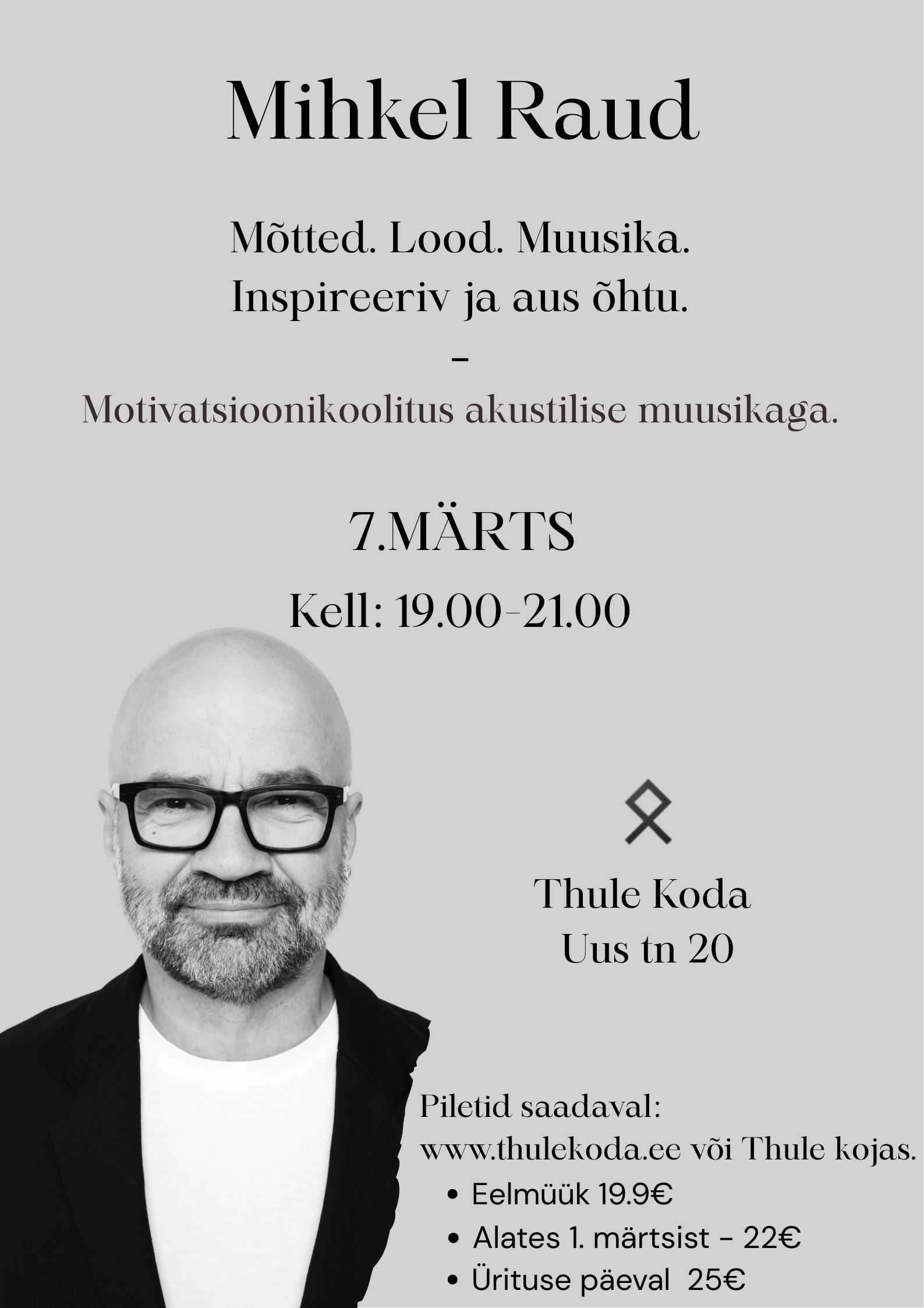 Eelmüük \ Early Bird 19.9€Alates 1. märtsist \ Late Bird (from 1 March) - 22€Ürituse päeval \ On event day - 25€