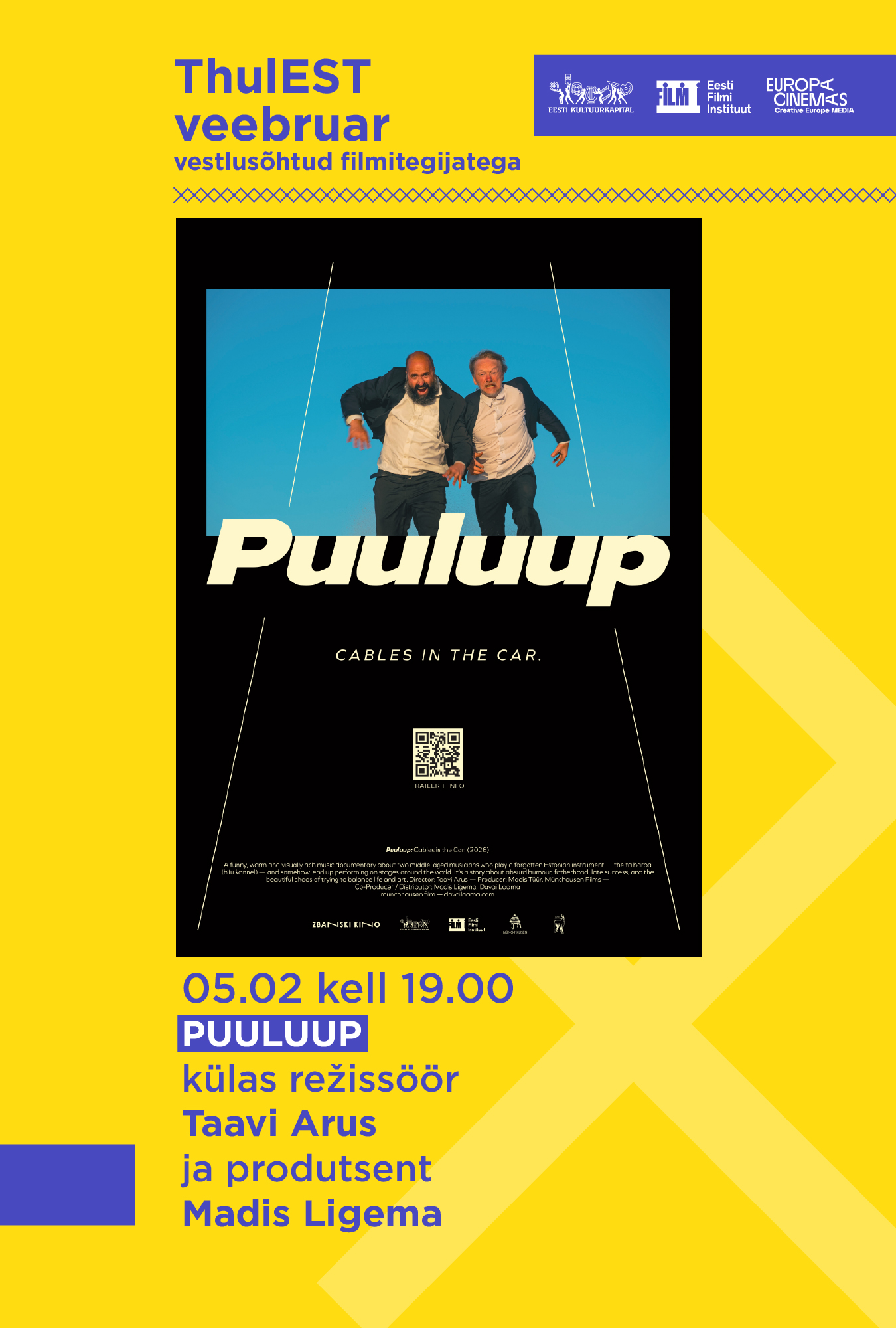 "Puuluup - kaablid autos veel" on muusikadokk, mis avab meie hiiu kandle duo Puuluup liikmete Ramo Tedre ja Marko Veissoni elu ja loomeprotsessi aastatel, mil nad on jõudmas rahvusvahelise edu laineharjale. “Neo-zombie-post-folk” muusikat viljeleva keskealiste poistebändi teekonda maailma tippu iseloomustab kuiv huumor ja absurdsed olukorrad. Selles globaalses portreefilmis põrkuvad lavade hiilgus ja argipäevaelu olme. Film heidab pilgu ka telgitagustesse, kuidas valmis koos ansambliga 5miinust laul, mis pääses Eestit esindama Eurovisioonile ja mille nime ei suuda bändiliikmed isegi korrektselt kirjutada.
