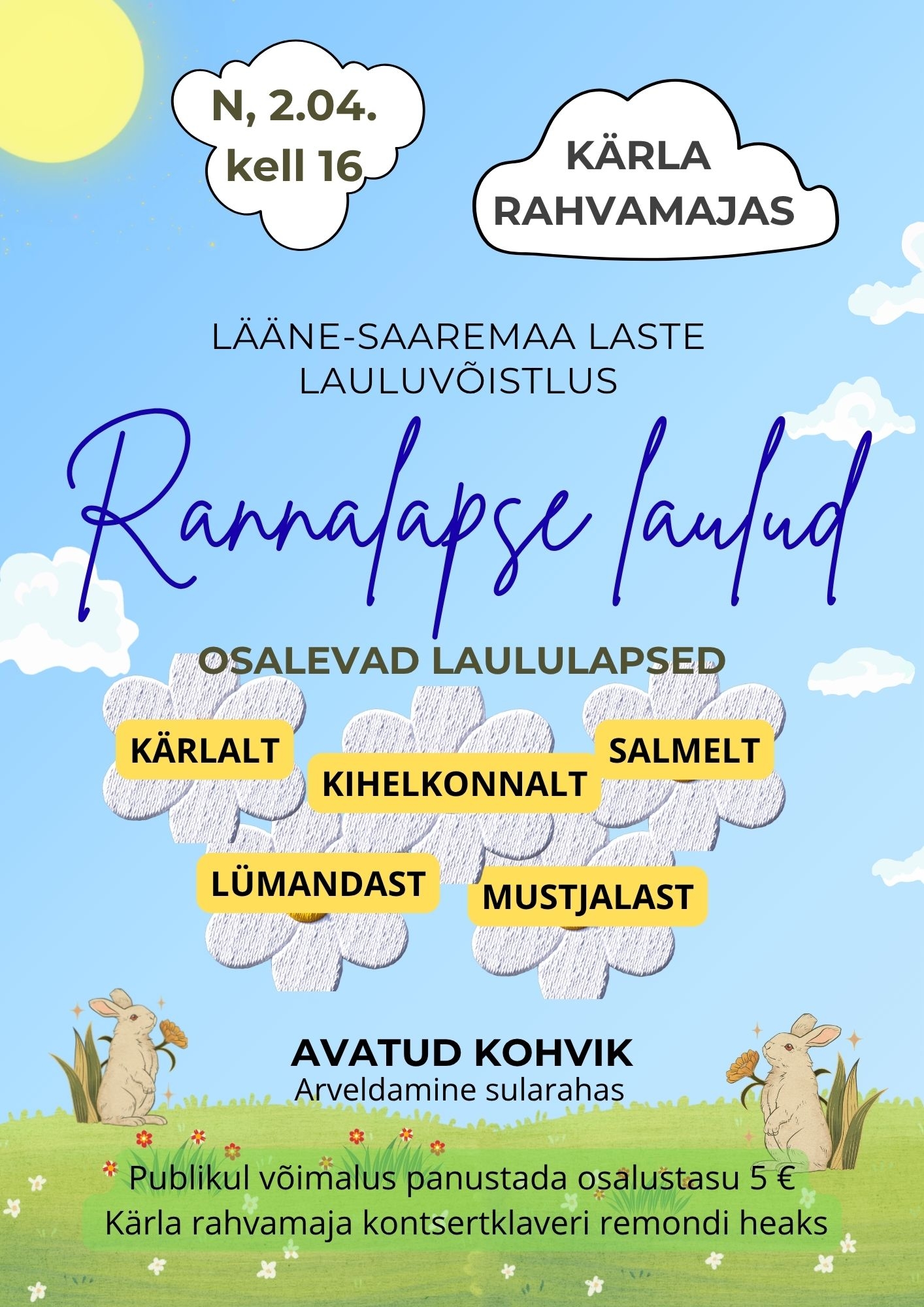 Lääne-Saaremaa laste lauluvõistlus Rannalapse laulud. Osalevad Kärla, Lümanda, Mustjala, Kihelkonna ja Salme lasteaedade ning koolide solistid.
